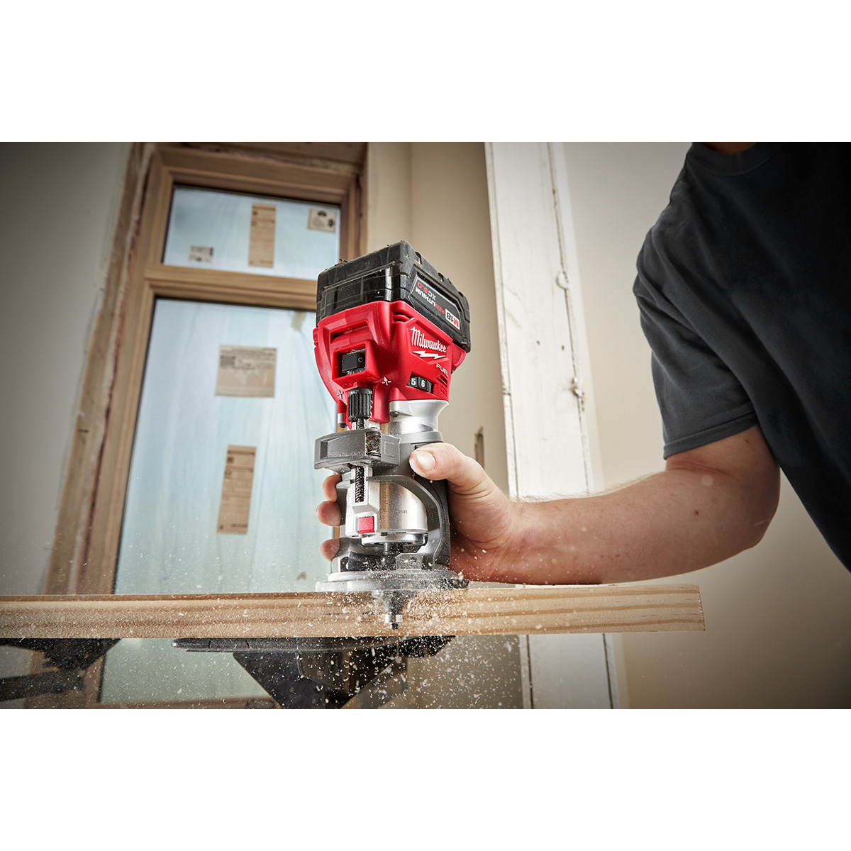 La fresadora compacta MILWAUKEE® M18 FUEL™ combina potencia, velocidad y ajustes precisos de profundidad para ofrecer cortes limpios y precisos en una variedad de materiales y aplicaciones. El enrutador compacto aprovecha el motor sin escobillas POWERSTATE™ y la electrónica REDLINK PLUS™. Esto ofrece la potencia de las fresadoras de corte con cable de 1,25 caballos de fuerza y las mejores 31 000 RPM de su clase, brindando a los usuarios potencia y velocidad para cortes limpios y de calidad en materiales duros. Con una batería M18™ REDLITHIUM™ XC5.0, el enrutador compacto inalámbrico corta hasta 250 pies de cortes redondos de 3/8″ en roble rojo, brindando a los usuarios tiempo de funcionamiento durante todo el día con menos viajes al cargador. El enrutador portátil está equipado con un dial de microajuste y un botón de macroajuste, que brinda a los usuarios ajustes de profundidad rápidos y precisos para un trabajo preciso. Un dial de velocidad variable con velocidades de 10,000 a 31,000 RPM brinda a los usuarios control en todas las aplicaciones. El enrutador de recorte también cuenta con un robusto 4 «La placa base proporciona estabilidad a los usuarios y las luces LED duales iluminan su superficie de trabajo. La fresadora compacta M18 FUEL™ es compatible con una base de inmersión y una base desplazada (se venden por separado).