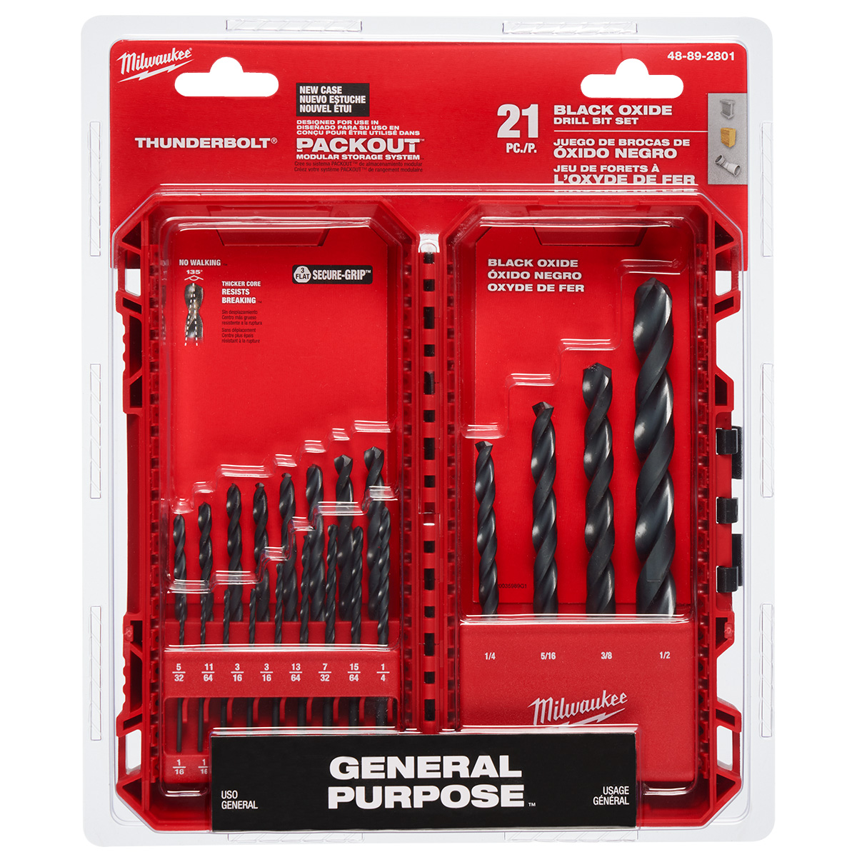 Nuestro juego de brocas con acabado de óxido negro THUNDERBOLT® de 21 piezas de MILWAUKEE® ofrece rendimiento para servicio pesado en el lugar de trabajo. El recubrimiento de óxido negro reduce la acumulación de calor y proporciona resistencia a la corrosión. El núcleo grueso proporciona la máxima resistencia y protege contra las roturas por carga lateral, mientras que una forma ranurada parabólica especialmente diseñada despeja astillas y residuos de manera rápida para mantener fría la broca. La punta dividida de 135° ofrece un arranque de precisión y evita los desplazamientos para realizar orificios rápidos y exactos. Las brocas con recubrimiento de óxido negro THUNDERBOLT® de MILWAUKEE® son ideales para diversas aplicaciones de perforación en madera, plásticos y metales. El juego se organiza en un estuche de accesorios personalizable diseñado para su uso en PACKOUT™.